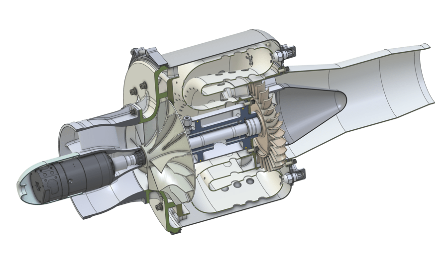 This was a quick design study that I did to flush out the details of a 200-pound thrust turbojet that I was designing in the background for several years. This engine incorporates a medium compression ratio centrifugal compressor and a reverse flow annular combustion chamber with high pressure fuel injection. The intent was to design an engine with a layout and packaging that could be practical for small aircraft applications. The engine has high pressure recirculating oil and an integrated starter generator in the nose.
